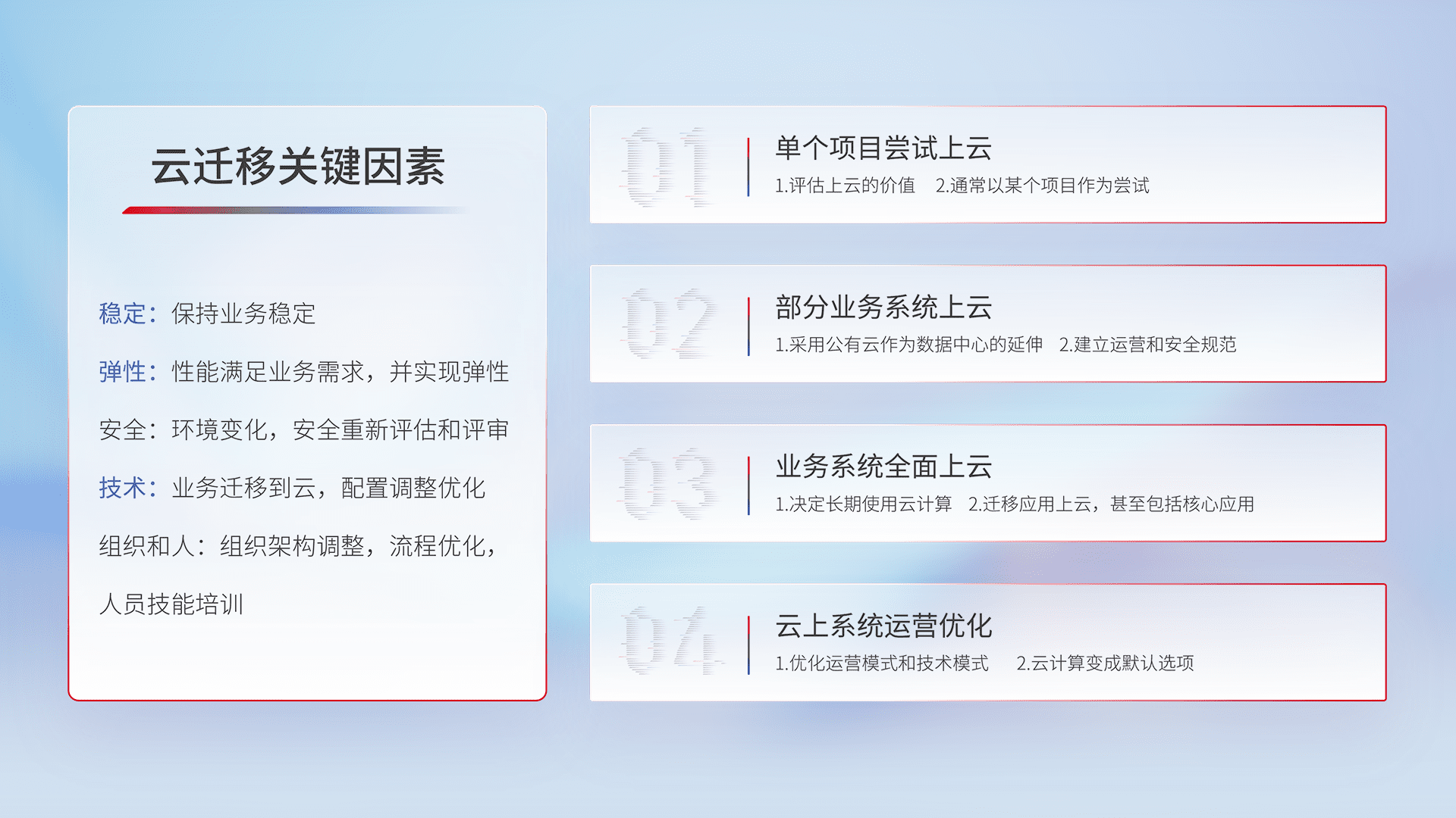 结合实际业务,,,,从规划设计、、云平台选型、、云原生改造、、、数据迁移、、、、集成交付,,,迁移全过程为客户识别最佳上云路径,,,做好风险识别管理,,,,设计网络架构、、、、身份权限、、安全审计合规、、操作审计、、、日志审计、、、、监控告警策略、、多站点容灾设计等,,,,对云上基础设施进行整体规划,,,,提升IT治理水平,,,以满足弹性、、高可用、、、高性能的需求。。。。