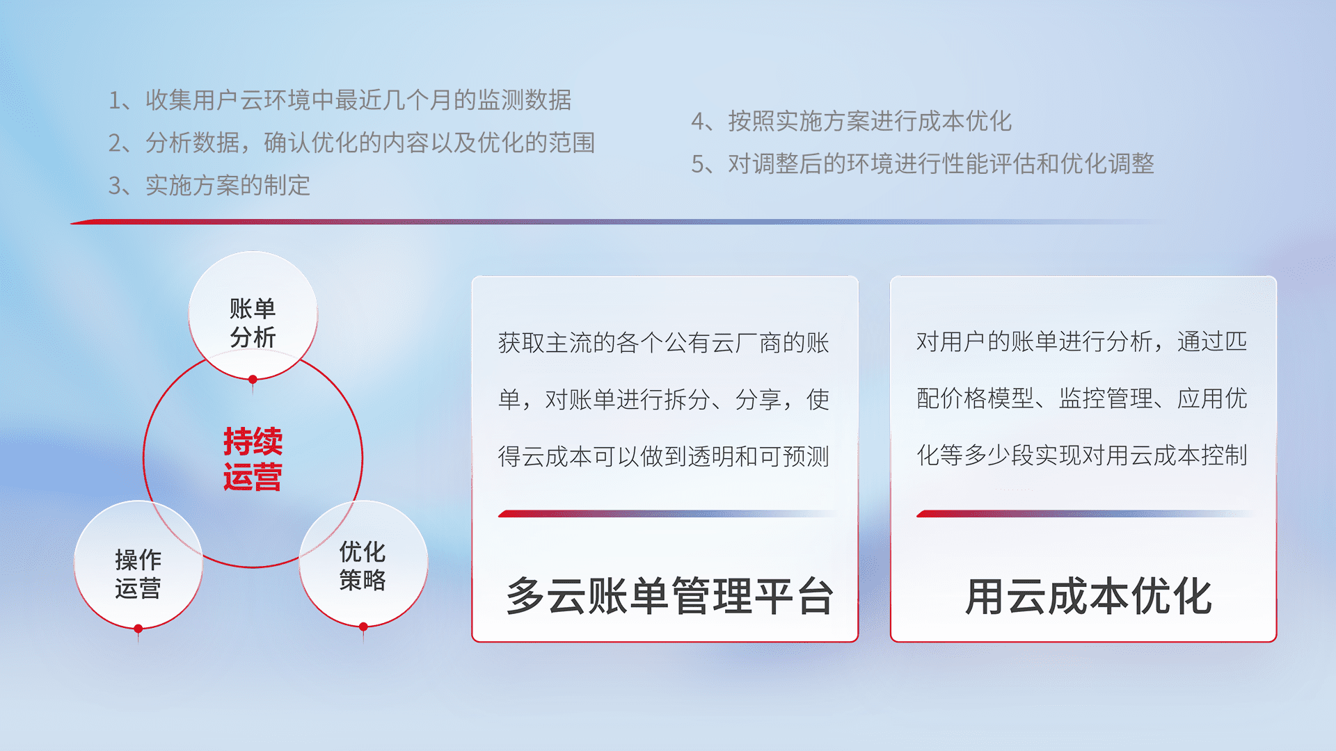 通过多云纳管,,,以统一的资源数据模型把客户的云资源进行抽象和封装,,,进而实现对多云资源的统一操作,,保障云资源管理的可靠性、、、稳定性与可用性。。量身定制化运维内容,,,配置、、、开发运维、、补丁管理、、备份、、、、监控、、认证和访问管理、、审计和日常巡检等,,保障在用云过程中的可靠度,,,,稳定度以及高可用率。。。。